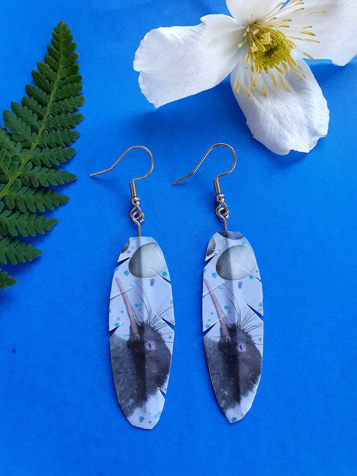 Art by Judi Lapsley Miller Feather Earrings -Pīwakawaka